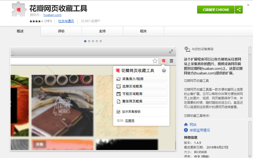 这个扩展程序可以让你方便地从任意网站上采集喜欢的图片、视频或者网页截图到花瓣网(huaban.com)上。这是花瓣网官方(huaban.com)提供的扩展。