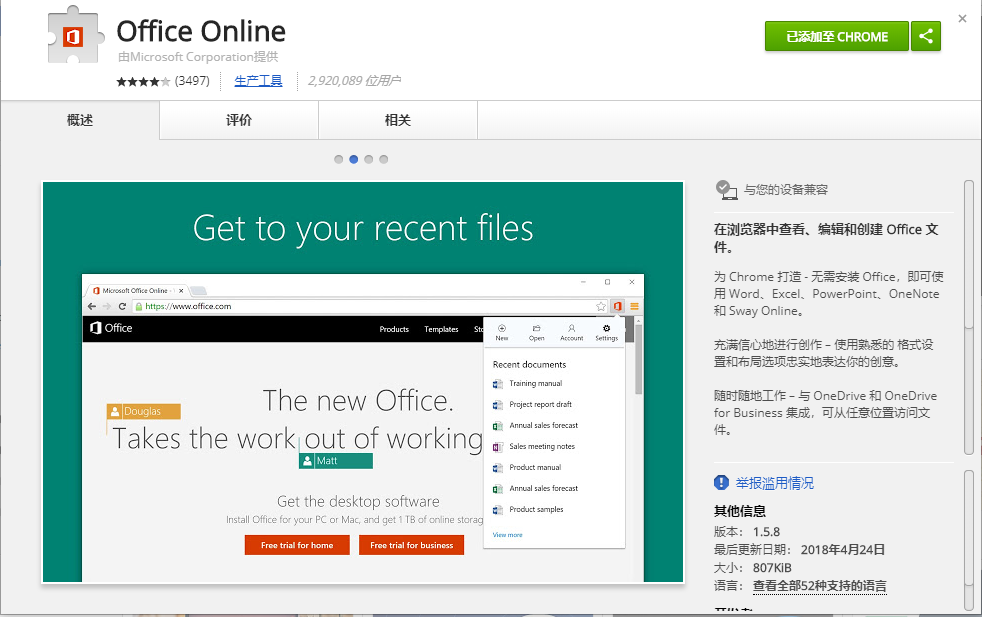 为 Chrome 打造 - 无需安装 Office,即可使用 Word、Excel、PowerPoint、OneNote 和 Sway Online。